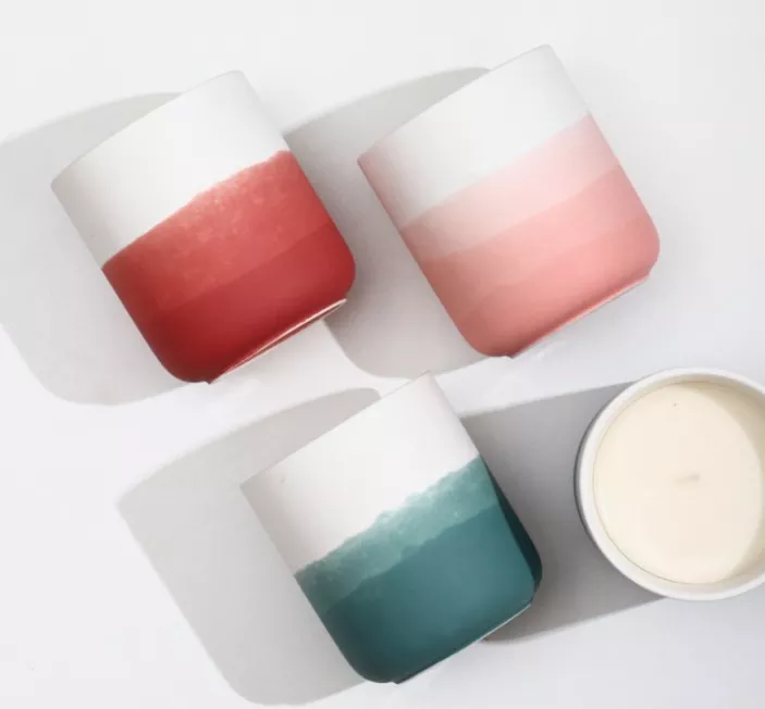Ombre keramické svíčky pro Ombre Arts & Crafts využívají pokročilé keramické zbarvení technologie k vytvoření bohatého a jemného barevného gradientu. Barevné přechody jsou neuvěřitelně přirozené, jako malba, která jemně protéká svícnem, přesouvá se z tmavé na světlo, od klidu na živé a vytváří jiný vzhled od každého úhlu. Ať už se pohlíží pod lampou nebo v přirozeném světle, jsou podmanivé a skutečně poutavé.